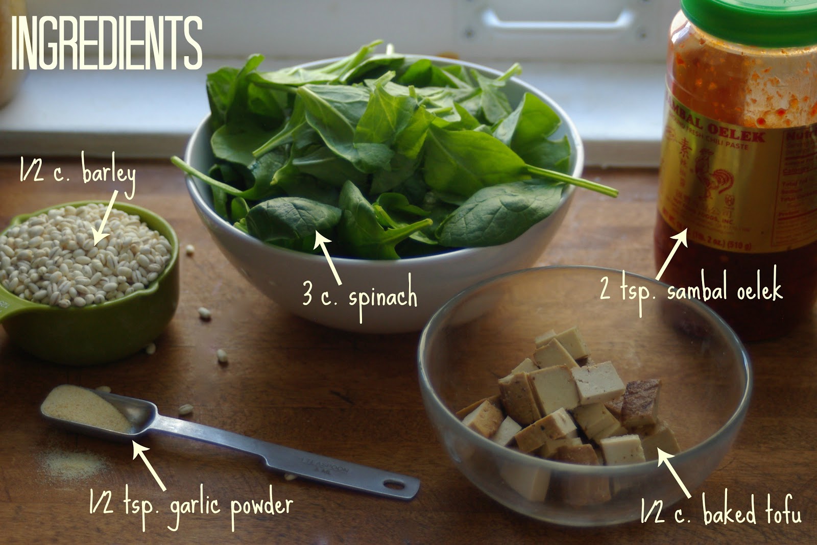 Put a pot of water on to boil and when it's rolling, add your grains and a bit of salt. When it's been cooking for about 5 minutes, heat a small skillet on medium and add your washed greens. Sprinkle with the garlic powder and move the spinach around until it wilts. Add the tofu and the sambal olek and stir to mix. Turn the heat down a bit.
